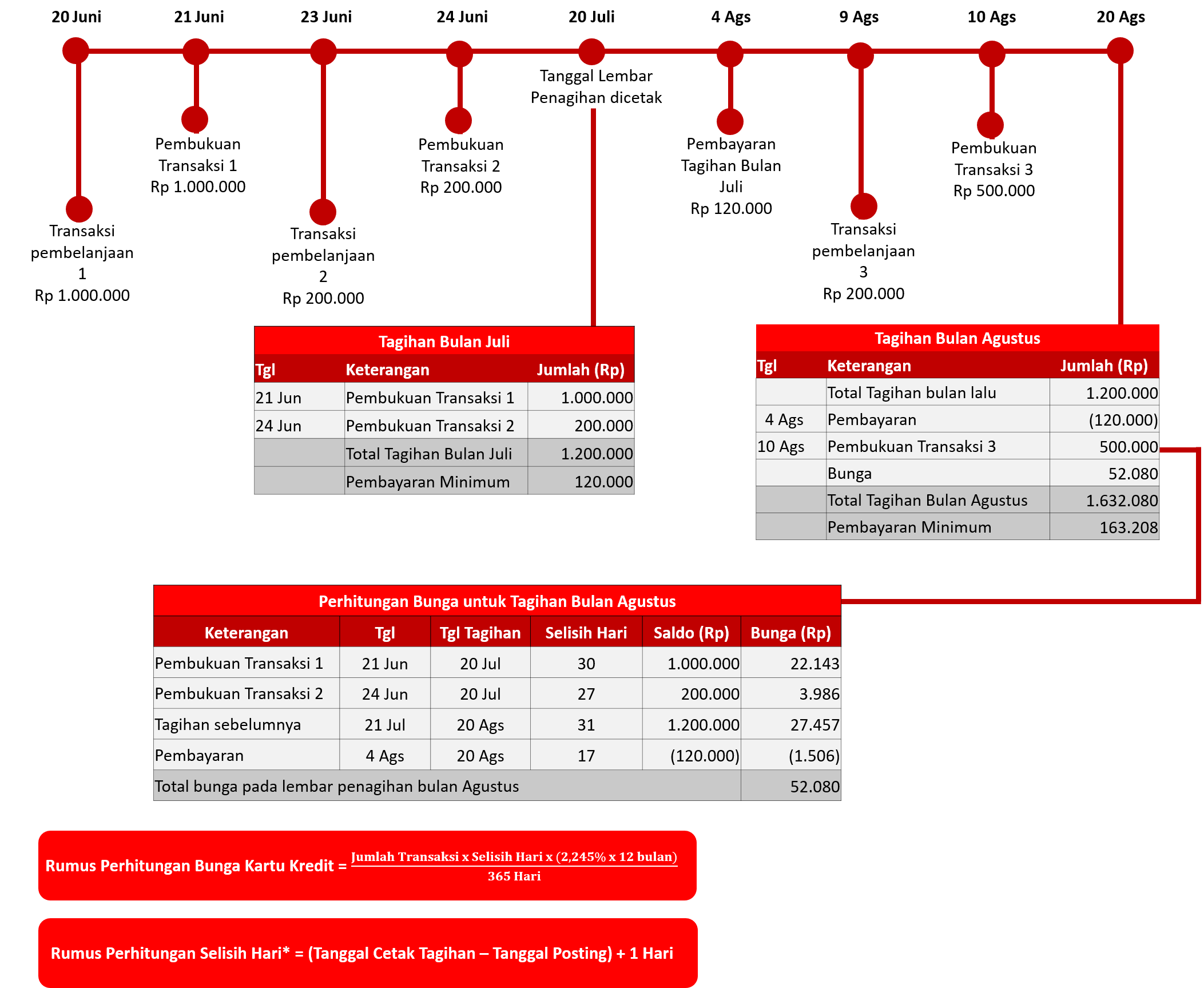 Interest will be charged if the Cardholder pays less than the total new bill, or pays after the Due Date. Interest for Shopping Transactions is calculated based on the Posting Date (Posting Date) of the transactions made. The interest rates that apply to purchase transactions are listed on the Billing Sheet. Unpaid costs, penalties, or interest are not included in the interest calculation component. Interest will be charged on the next billing sheet. For a complete interest calculation can be seen in the illustration of credit card interest calculations.