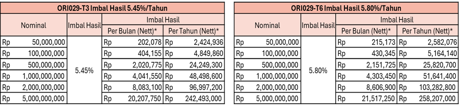 Pemerintah kembali akan menerbitkan seri Obligasi Retail ke 29 (ORI029), dengan tema “Pilihan Berharga Untuk Tumbuh Dan Berdaya”. Pada penerbitan kali ini, pemerintah mengeluarkan dua jenis tenor yang berbeda yaitu 3 tahun ORI029T3 dengan kupon 5.45% gross (4.95% nett) per tahun dan 6 tahun ORI029T6 dengan kupon 5.80% gross (5.22% nett) per tahun, yang sudah ditawarkan mulai 26 Januari hingga 19 Februari 2026.
